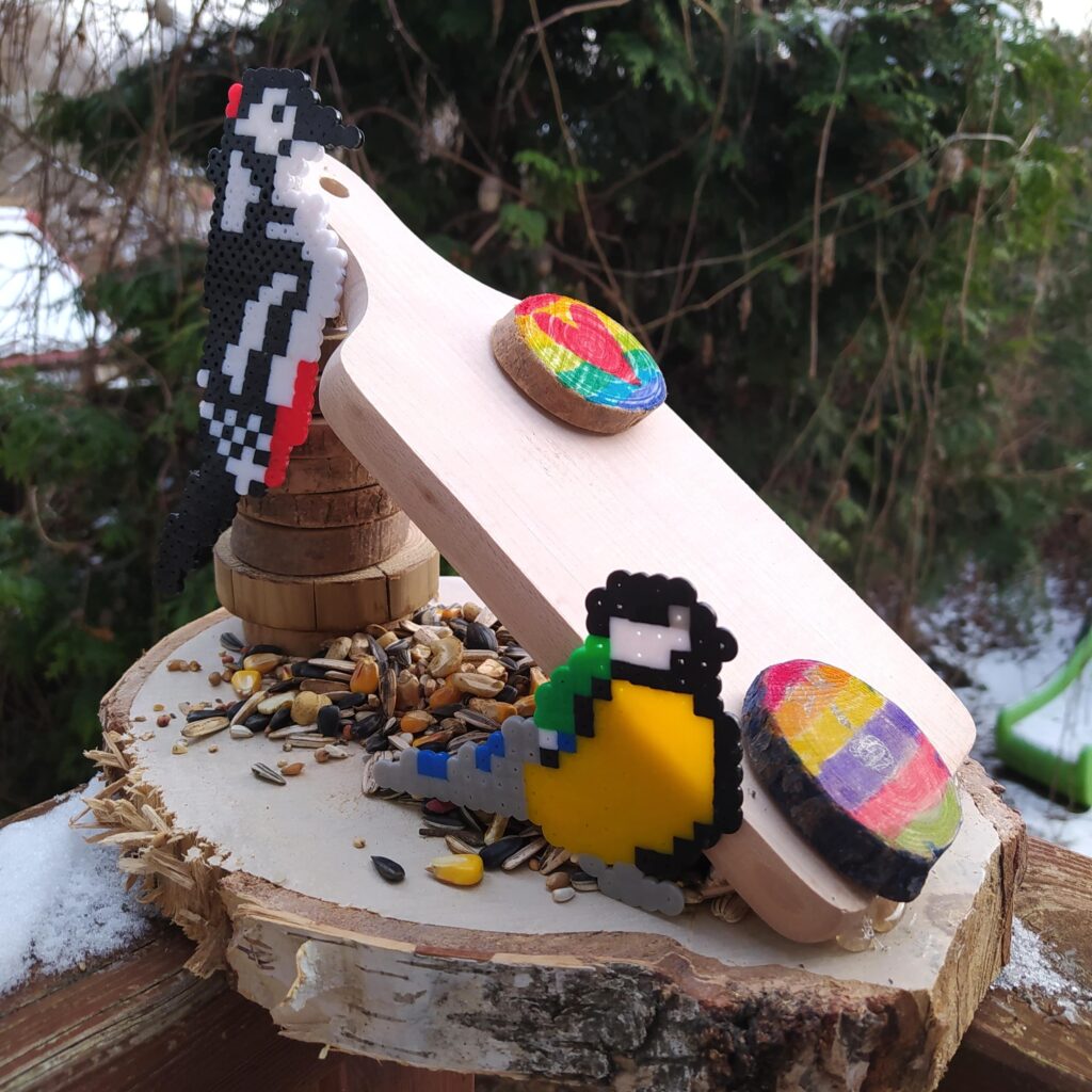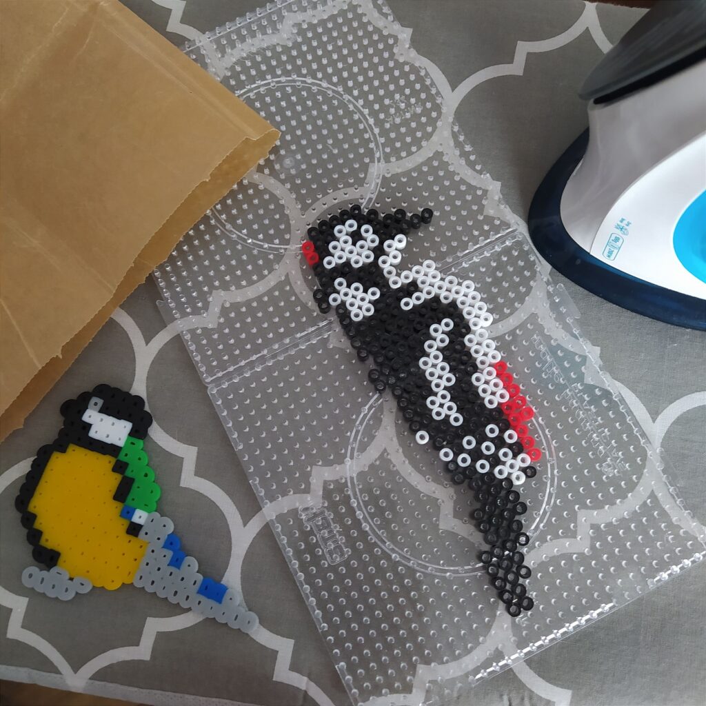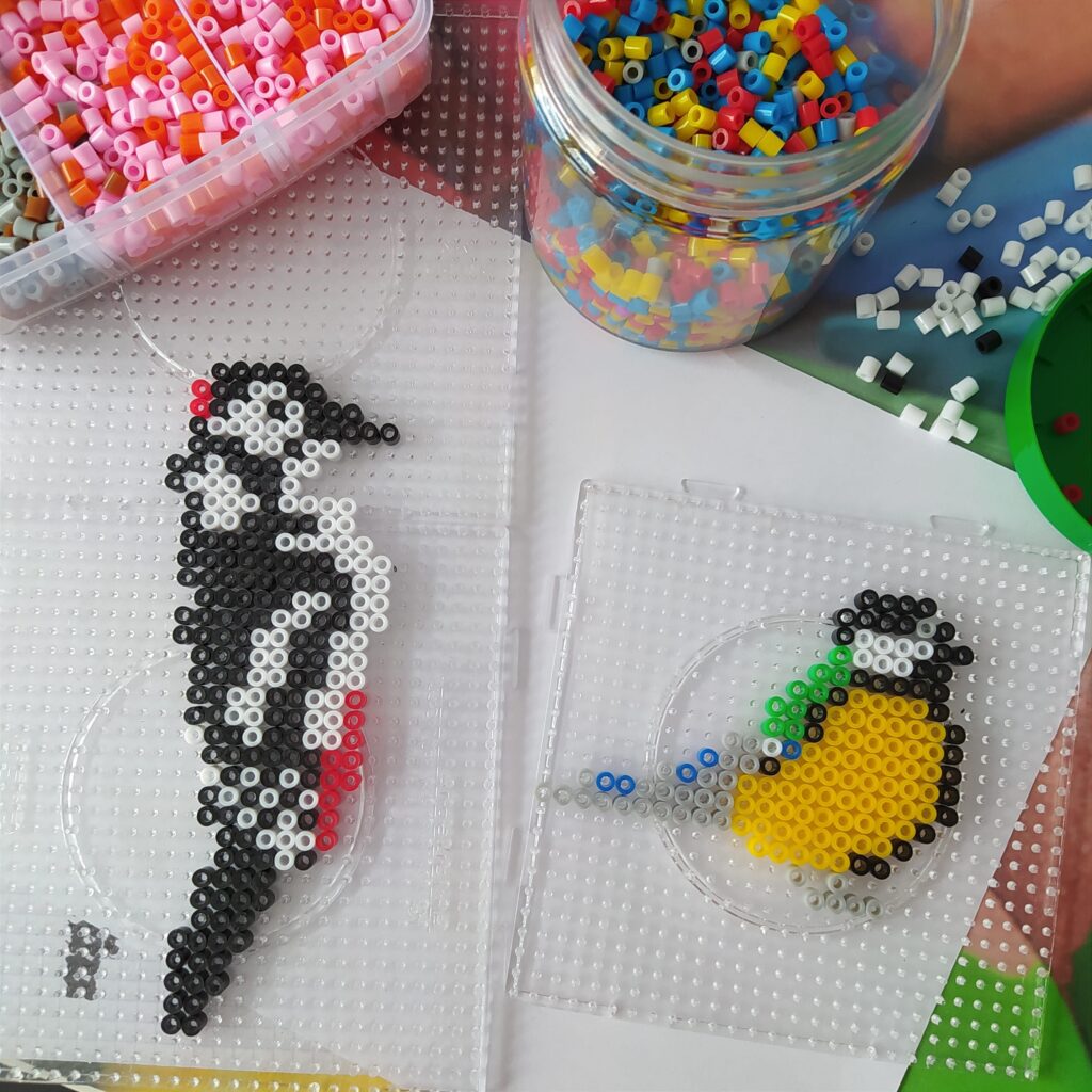 Kolejno sklejamy elementy ze sobą. Baza już jest, tak trochę powiało nudą. Wpadłyśmy na pomysł, że trzeba go jeszcze jakoś ozdobić. Z pomocą przyszły koraliki do prasowania i kilka inspiracji z Pinterest. Skoro to karmnik to musi być ptak. Ola zdecydowała, że ułoży dzięcioła Iza zrobiła sikorkę.