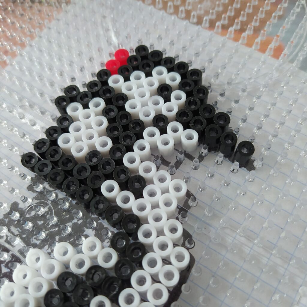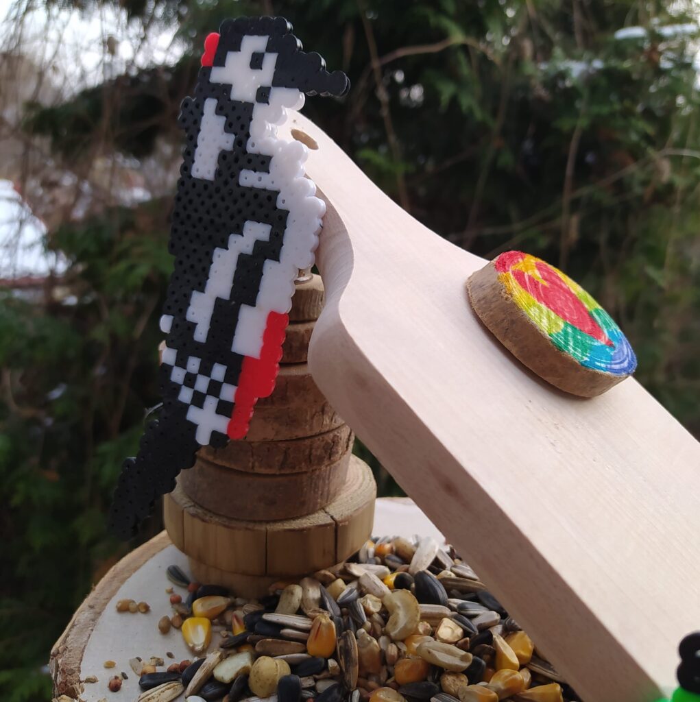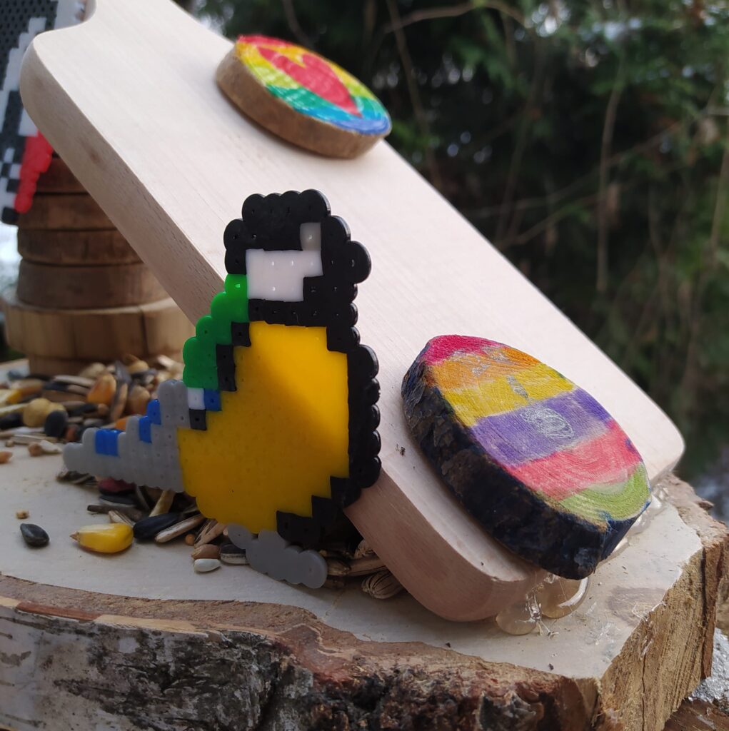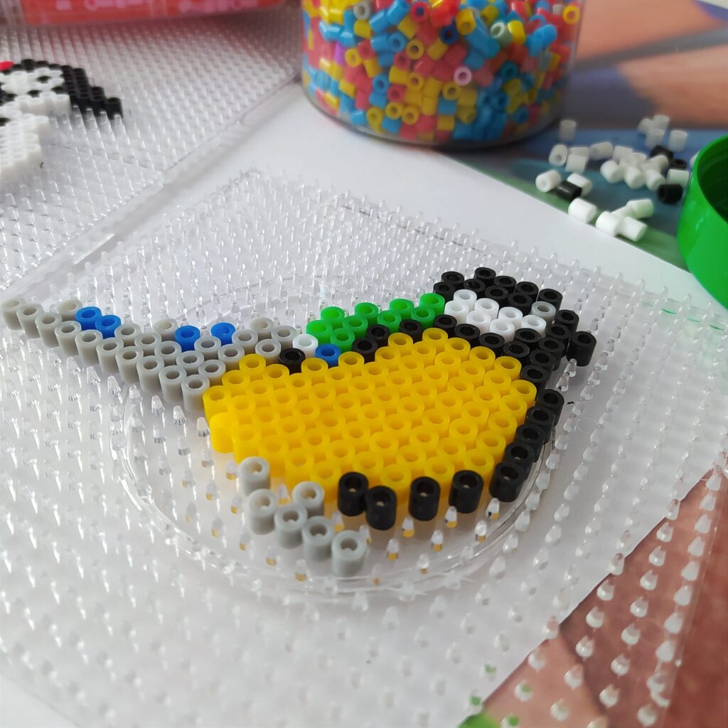 Kolejno sklejamy elementy ze sobą. Baza już jest, tak trochę powiało nudą. Wpadłyśmy na pomysł, że trzeba go jeszcze jakoś ozdobić. Z pomocą przyszły koraliki do prasowania i kilka inspiracji z Pinterest. Skoro to karmnik to musi być ptak. Ola zdecydowała, że ułoży dzięcioła Iza zrobiła sikorkę.